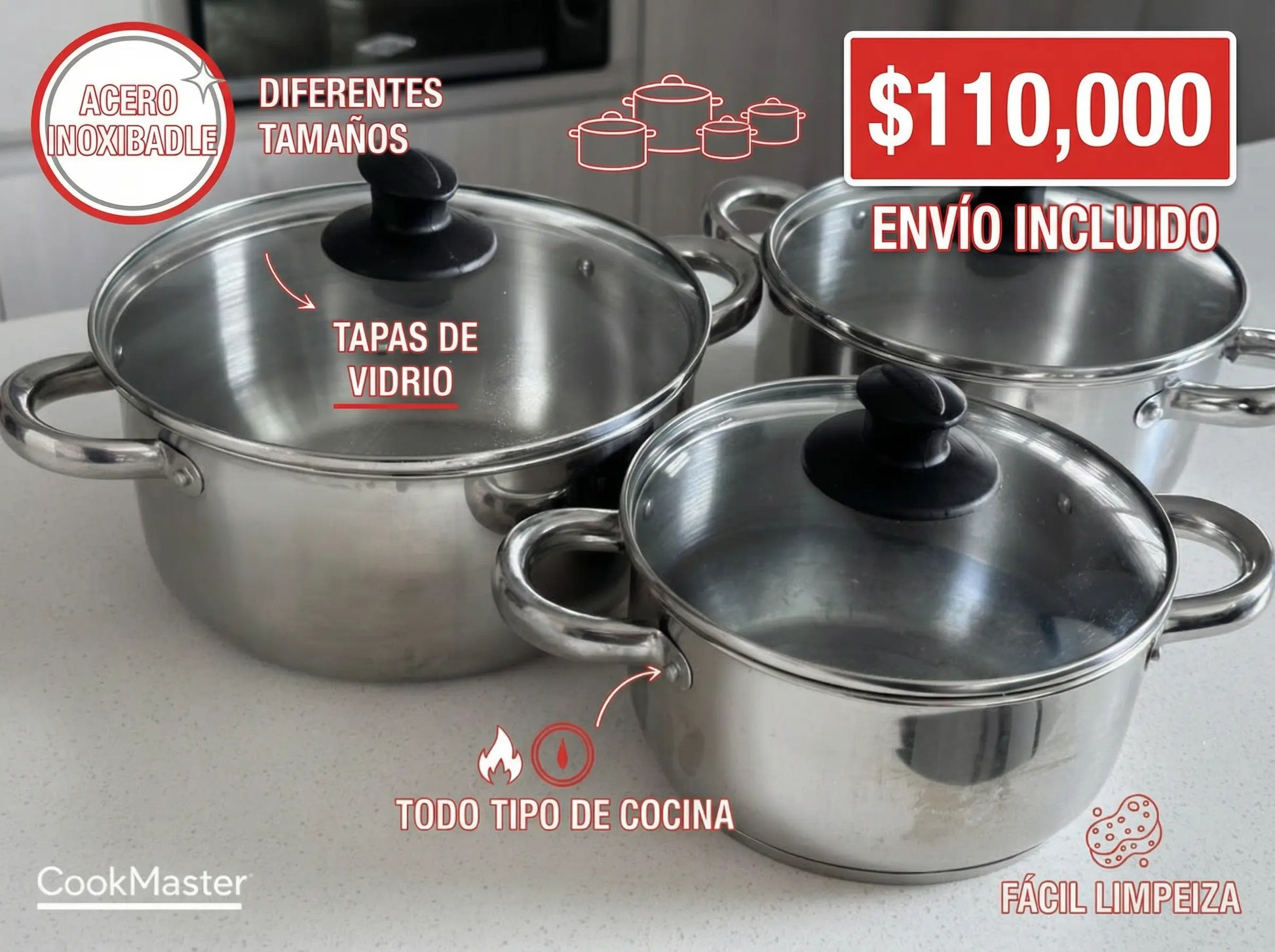 Juego de 3 ollas en acero inoxidable, resistentes y elegantes.